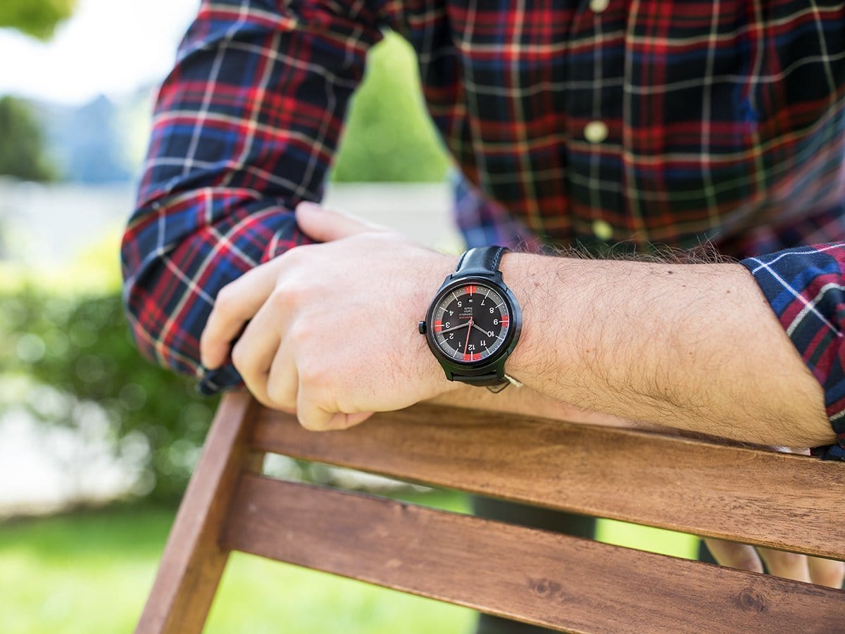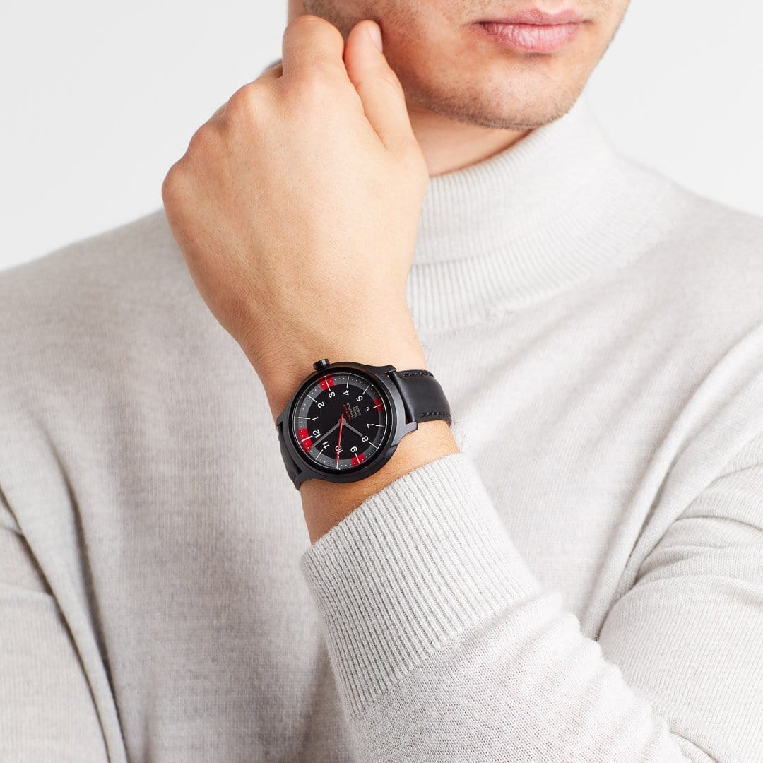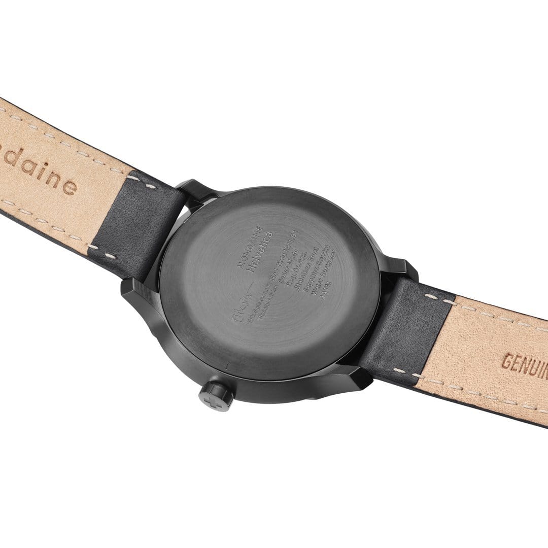 Craftsmanship and design. The Mondaine Helvetica watches are characterized by the modern interpretation of timeless design. The Spiekermann Edition enhances this exceptional feature with the left-aligned numbers on the black dial and the colour accents in grey and red. The watch is crafted from high-quality materials and comes with a scratch resistant sapphire crystal.