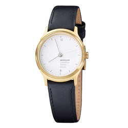 Light design. The gold-plated stainless steel case of this Mondaine Helvetica NO1 Light imparts a timeless and elegant simplicity to the watch. Thanks to its small size with a diameter of only 26mm the watch perfectly fits delicate wrists. The lightness of the design is reflected by the white dial with the tone-on-tone second hand, perfectly guarded by the sapphire crystal.