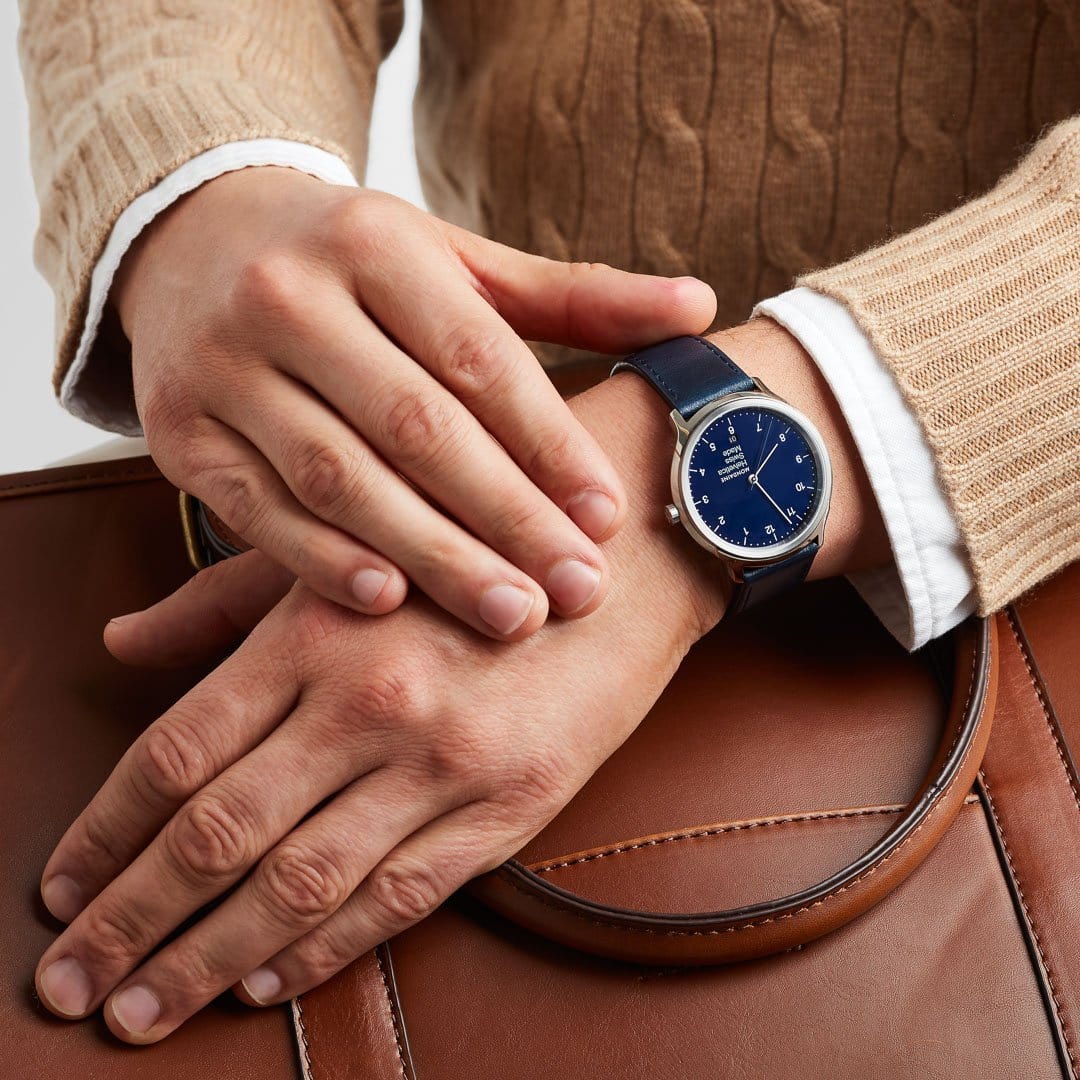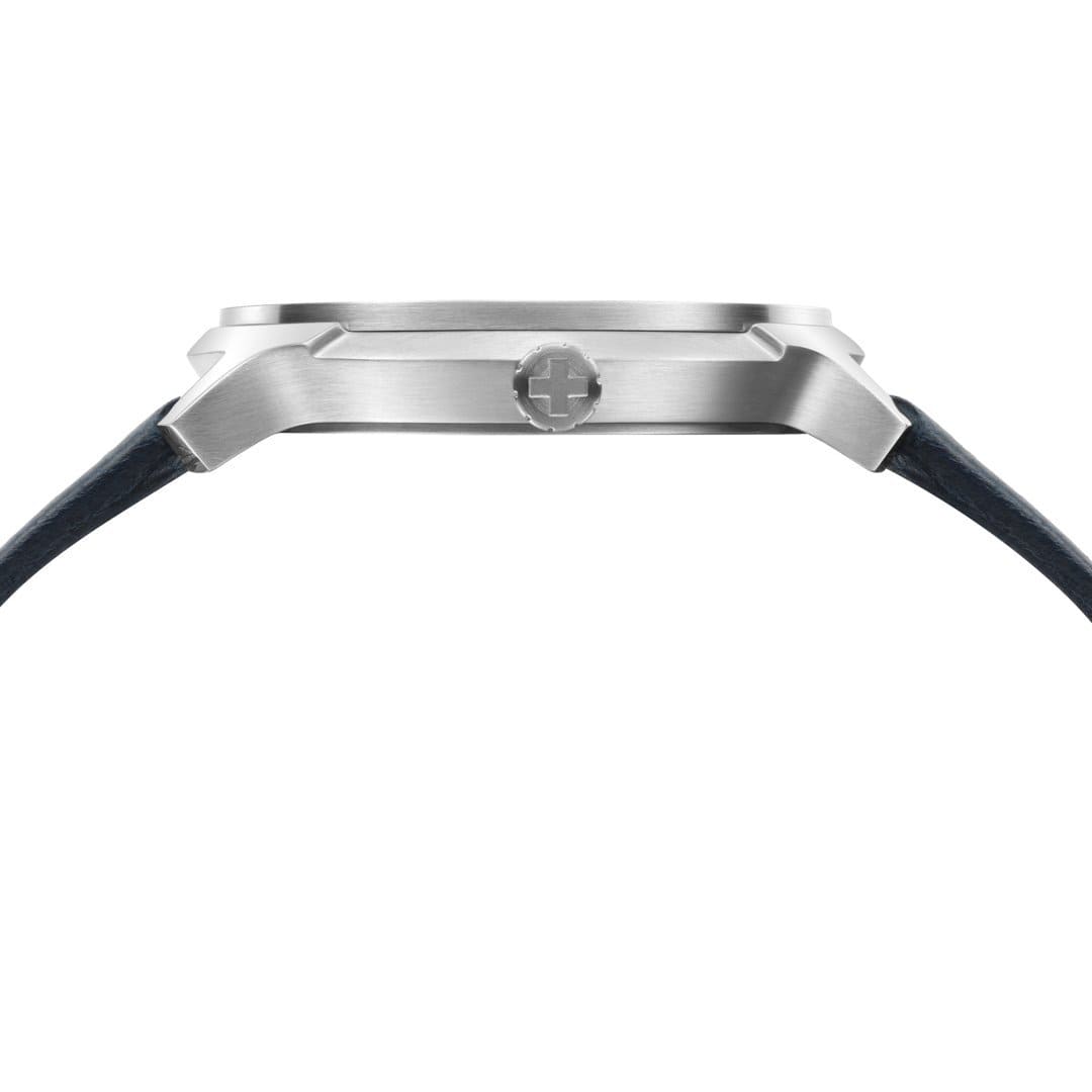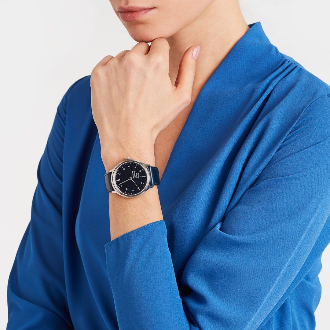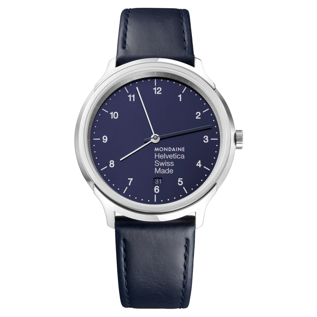 The blue of the night and function are combined in timeless elegance. The date indication on the marine dial of the Mondaine Helvetica NO1 Light is aligned to the left on the bottom which is unique. The high-quality case made out of polished stainless steel, the scratch resistant sapphire crystal and the blue leather strap demonstrate simplicity and Swiss craftsmanship.
