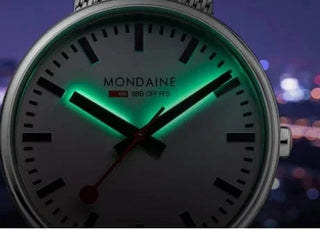 Das stromunabhängige Beleuchtungssystem von Mondaine bewahrt ein jahrelanges permanentes Leuchten, das eine stetige dauerhafte Ablesbarkeit ohne zusätzliche Lichtquellen gewährleistet.